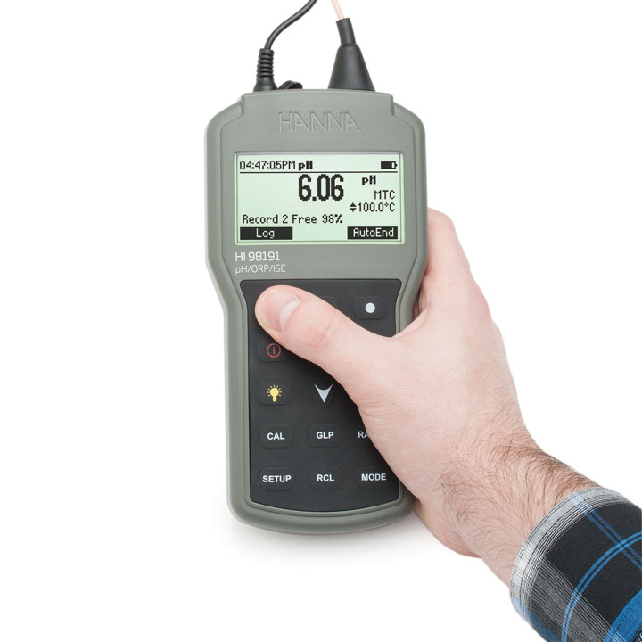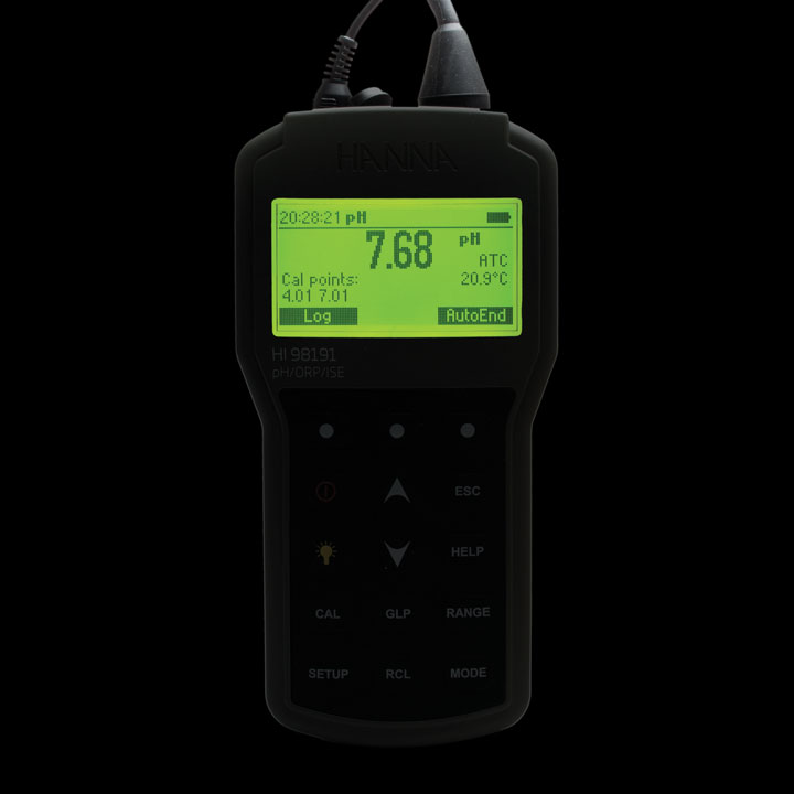 Das HI98191 misst pH im Bereich von -2 bis +20 mit einer Auflösung von bis zu 3 Nachkommastellen. Mit einer geeigneten Sonde bestimmt es auch Redoxpotential und unterstützt 17 verschiedene ionenselektive Elektroden (ISE). Dieses professionelle Gerät kann einfach mit einer Hand bedient werden. geliefert wird es im robusten Koffer mit komplettem Zubehör für die pH-/Temperaturemessung.